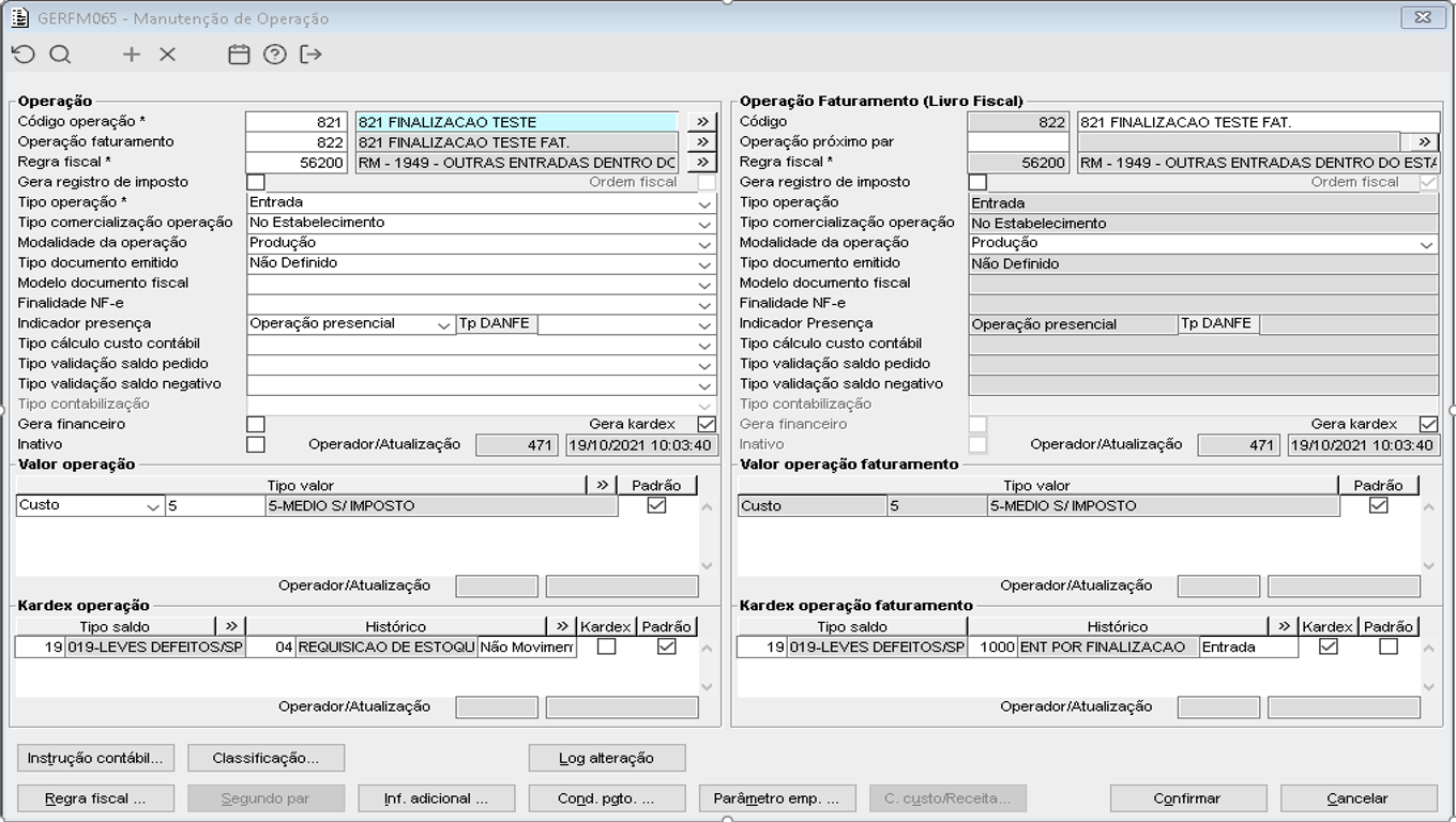 No momento da finalização é necessário selecionar manualmente a operação desejada, caso não seja selecionada o sistema finalizará pela operação padrão (950) e alimentará o saldo 1 FÍSICO.