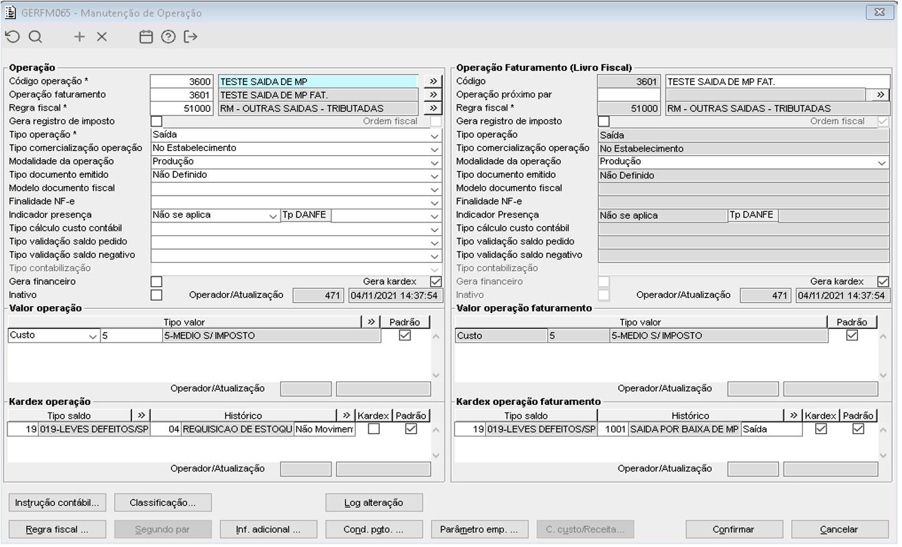 O primeiro passo é criar as operações necessárias. No GERFM065 pode-se criar operações e especificar os saldos desejados. Faz-se uma operação para alimentar o saldo com os produtos finalizados e outra para os componentes que a OP pode possuir.