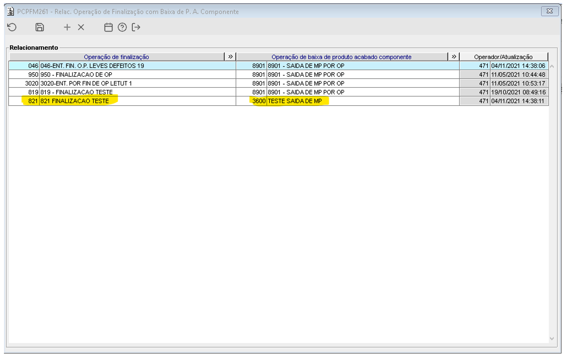 Após a criação das operações, se faz necessário relacioná-las no PCPFM261;