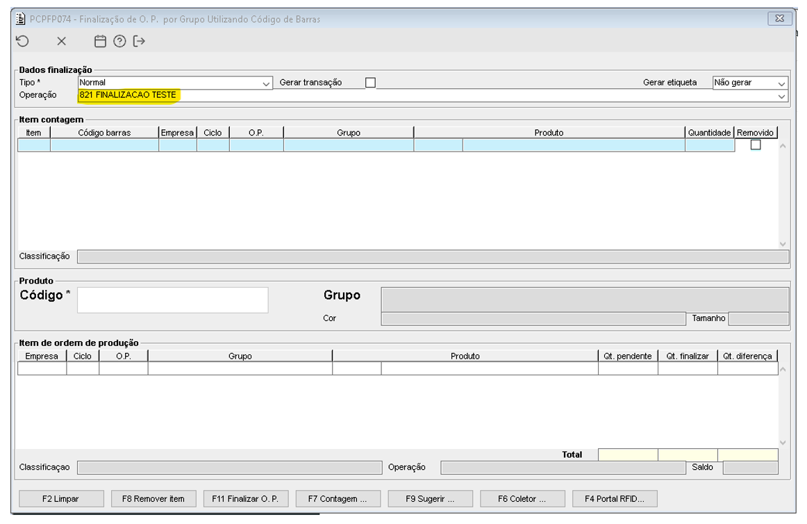 Após isso, basta liberar a operação para o usuário no componente de finalização PCPFP074.